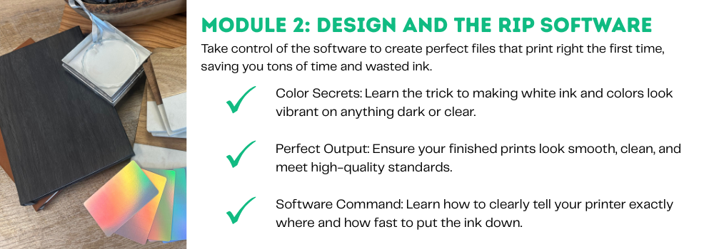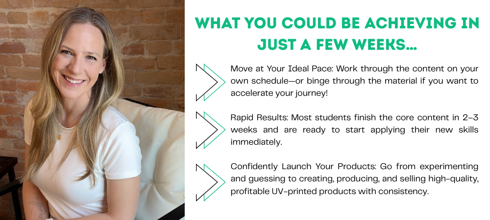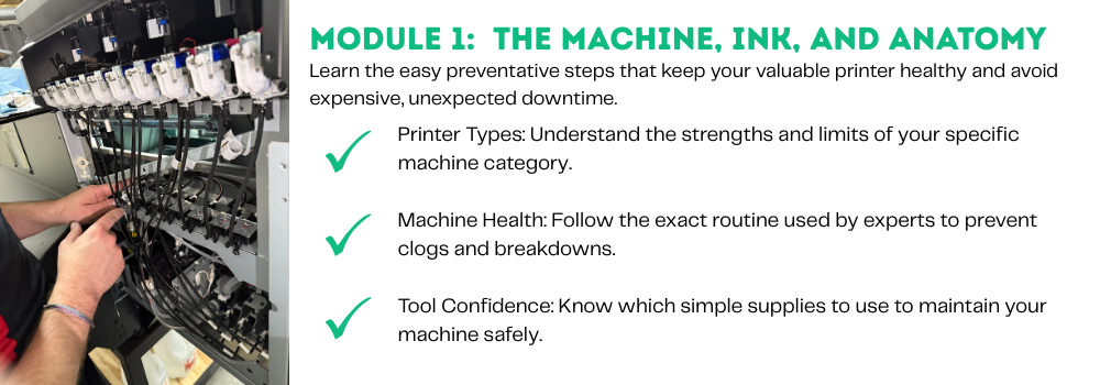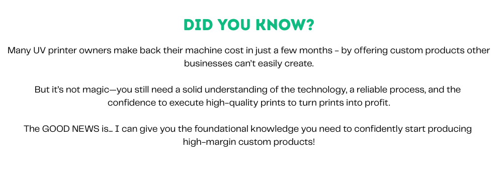 While I can’t provide one-on-one tech support for individual machines, I can help clarify course topics, troubleshooting steps, or general UV printing concepts. You can contact me directly through the support email listed in your course dashboard.
